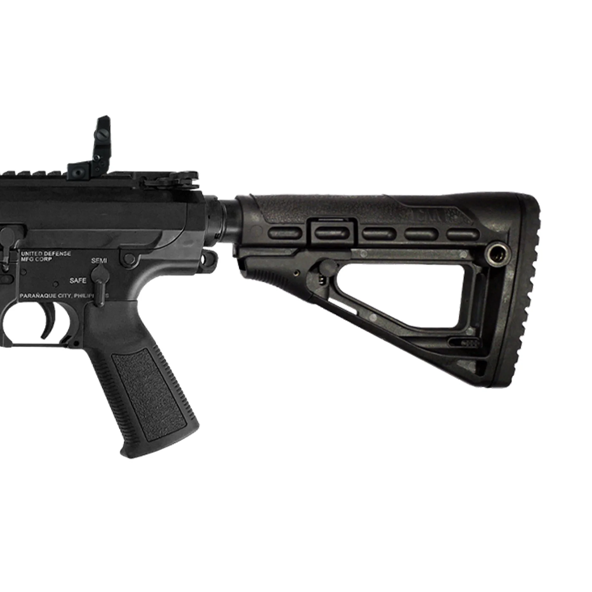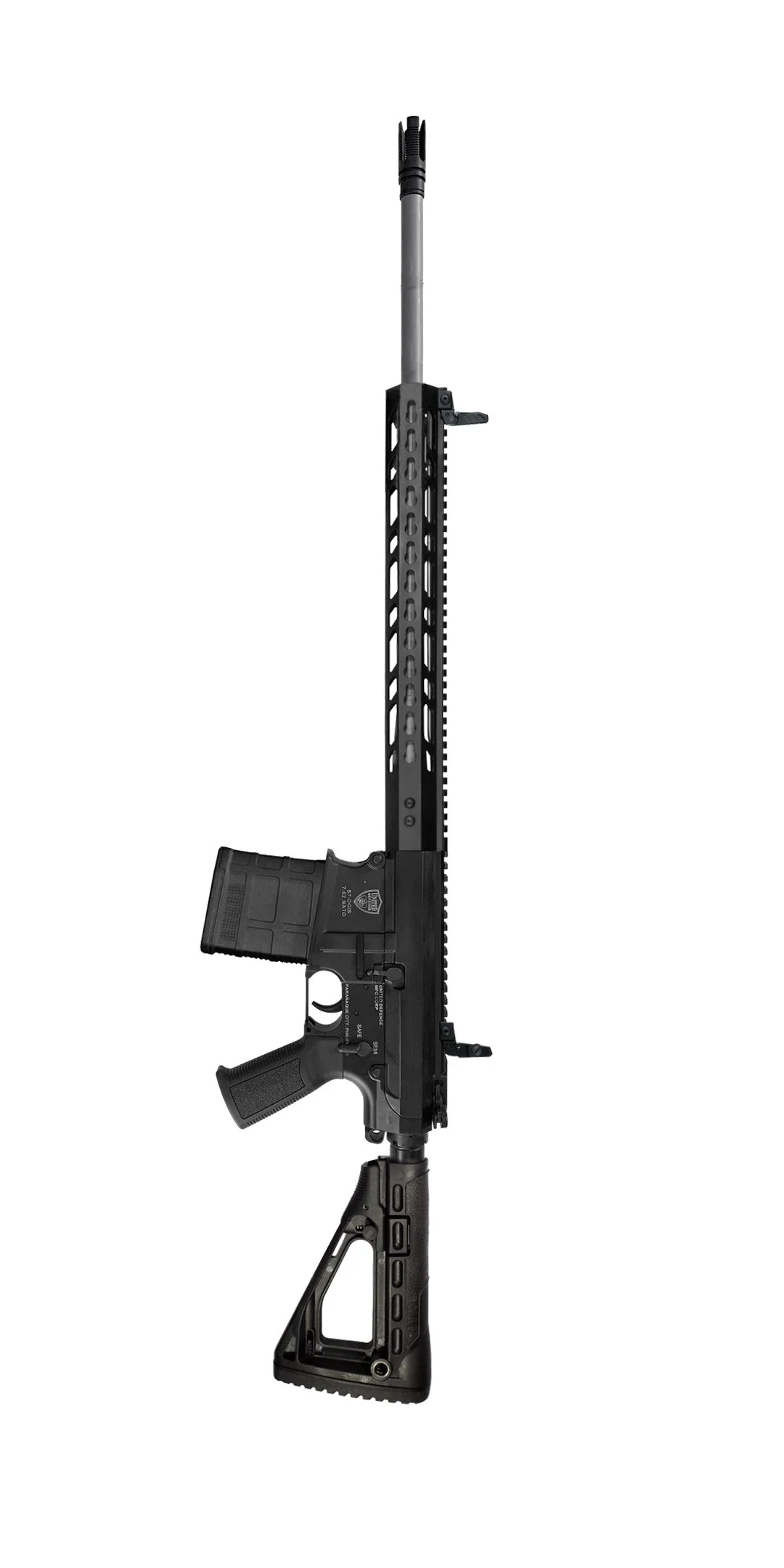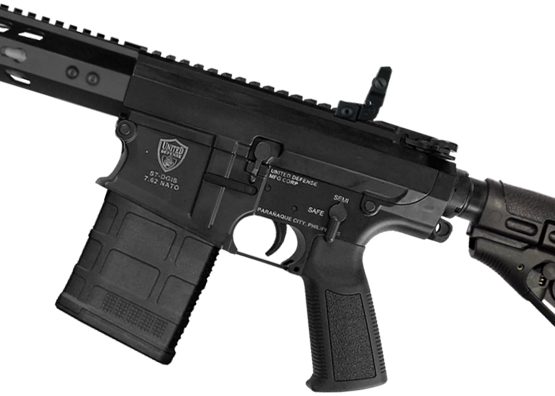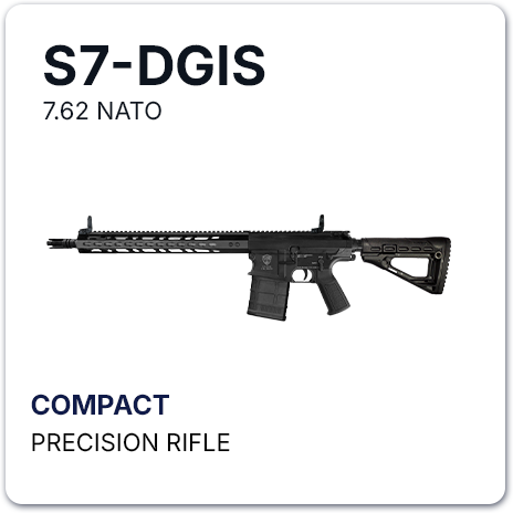 United Defense Mfg Corp’s S7-DGIS is a variant of the M110- SASS, Semi-Automatic Sniper System precision rifles chambered in the time-tested 7.62 NATO round (7.62 x 51mm) and designed to hit point targets up to 800 meters (MER) and area targets up to one kilometer. The S7 takes after the M110 battle rifle designed by Eugene Stoner. The DGIS is a simple design that uses the hot gases coming from the gas port of the barrel and through a gas tube the hot gases are rammed into the bolt carrier group to cycle the round. The S7-DGIS uses a one piece KeyMod picatinny rail handguard held securely only at the barrel extension which allows the barrel to “float” and preserve barrel harmonics while in battery. This allows for greater accuracy and consistency. As designed, the barrel does not touch any part of the entire length of the handguard except at the barrel extension. The barrel comes in different lengths: 14.5, 16, 18, 20, 22.5, 24 and 25 inches with a choice of either fixed or retractable buttstock.
